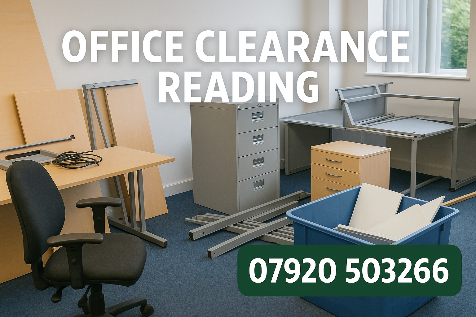 A quick and professional office clearance completed in Reading, clearing unwanted desks, chairs and old equipment. Same-day and next-day commercial rubbish removal available.